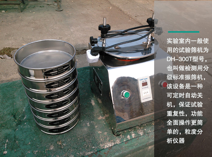 實(shí)驗(yàn)室內(nèi)一般使用的試驗(yàn)篩機(jī)為DH-300T型號(hào),也叫做檢測用分級(jí)標(biāo)準(zhǔn)振篩機(jī),該設(shè)備是一種可定時(shí)自動(dòng)關(guān)機(jī),保證試驗(yàn)重復(fù)性,功能全面操作更簡單的,粒度分析儀器。可將一種顆粒料同時(shí)精密分出2~8個(gè)粒子段?捎糜跐{液料的細(xì)度及雜物含量分析,噪音小,重量輕;平臺(tái)操作,無須固定。調(diào)節(jié)振動(dòng)快,可調(diào)節(jié)振幅。
