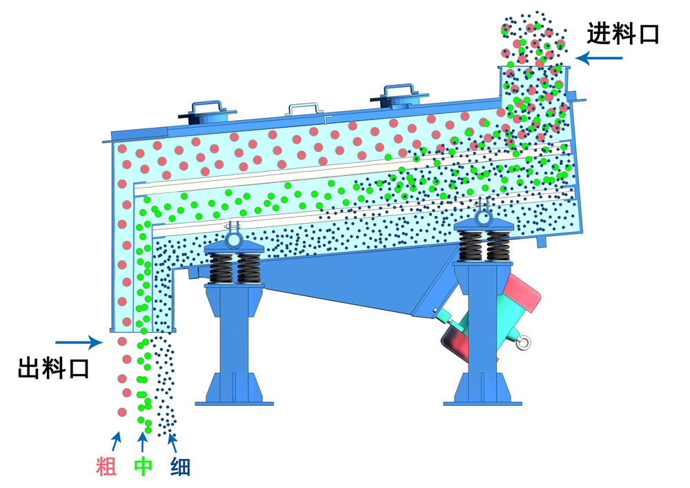 直線運動振動篩借助振動電機產(chǎn)生的激振力,驅動篩箱做定向直線往復運動,以此實現(xiàn)物料篩分。工作時,物料從進料口均勻進入篩面,在篩箱的直線運動作用下,沿著篩面持續(xù)向前移動。篩網(wǎng)有1-5層可選,通常1層是簡單的除雜,2-3層篩網(wǎng)能將物料分為3-4個粒度等級,從而完成粗、中、細的篩分需求,4-5層篩網(wǎng)主要完成物料的精細化分級。通過這種直線運動主導的分級方式,可完成2-6個粒度等級的物料分離。