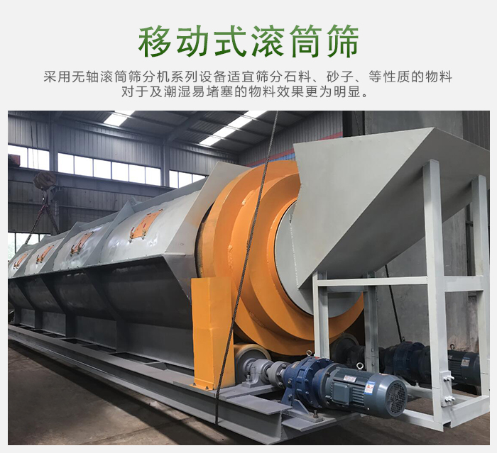 移動式滾筒篩沙機被廣泛應用于礦山、建筑、交通、化工等行業(yè)。滾筒篩沙機常用在粗細物料的分級篩選,從而提高物料的質量。