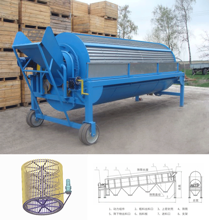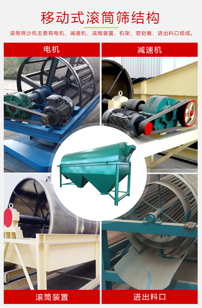 滾筒篩沙機主要有電機、減速機、滾筒裝置、機架、密封蓋、進出料口組成。