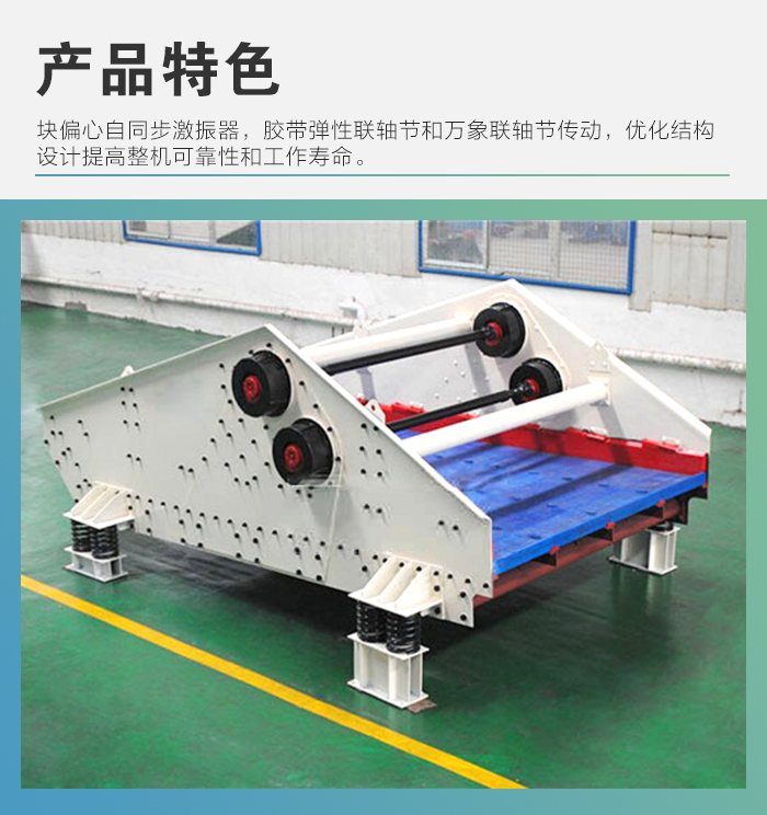 1.采用塊偏心自同步激振器。 2.采用膠帶彈性聯(lián)軸節(jié)和萬象聯(lián)軸節(jié)傳動 3.優(yōu)化結(jié)構(gòu)設計提高整機可靠性和工作壽命