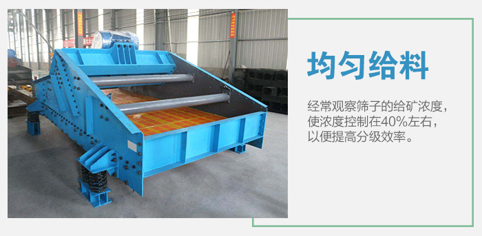 1、設備正常運轉(zhuǎn)時,應經(jīng)常觀察篩子的給礦濃度,使?jié)舛瓤刂圃?0%左右,以便提高分級效率。 2、因該篩分級效率高,脫水性能好,篩上量濃度高,使得篩上量溜槽中的礦漿流動性差,應配上水管。