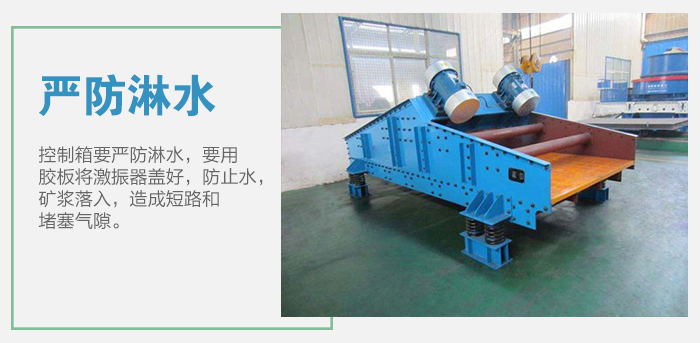 3、電磁激振器與控制箱要嚴防淋水,以免短路。要用膠板將激振器蓋好,防止水,礦漿落入,造成短路和堵塞氣隙。 4、隨時檢查各部位螺栓是否松動,以及篩框是否與溜槽等碰撞。
